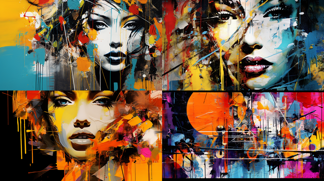 "절충적인 퓨전 아트, 다양한 스타일의 시각적 요소의 혼합된 형태, 다채로운 팔레트와 시각적 다양성, 강렬한 비평과 극적인 시각적 충격, 끊임없이 변화하는 스타일과 질감의 조합, 다양한 예술적 관점을 결합한 독특한 모양과 구성, 디지털 아트 기법과 회화 기법의 결합, 레이어드와 혼합된 매체의 활용, 현대적이고 실험적인 분위기, 다양성과 융합에 대한 강조, 추상적이고 사실적인 표현의 혼합, 공간, 시간, 사물의 변화와 변형 주제"