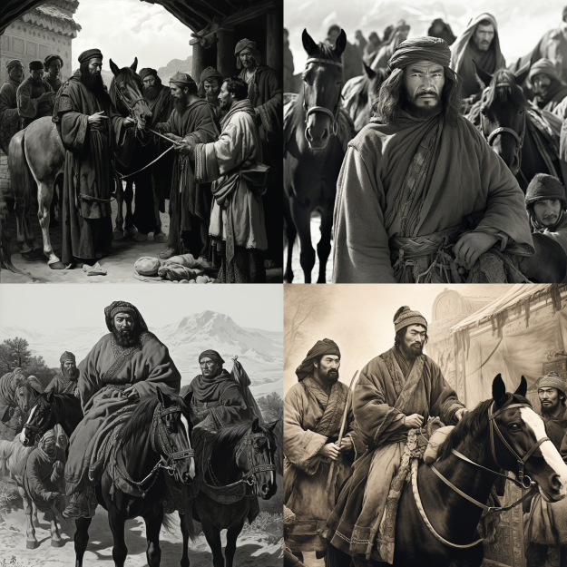 👉A black and white photo of Marco Polo, trading with Mongol horsemen in the Silk Road, 1271