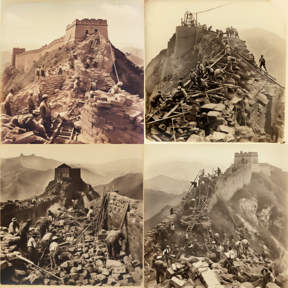 👉A polaroid photo of the construction of the Great Wall of China, with workers laying bricks and stones, 1300s